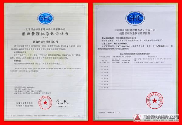 Xingtai Steel passed the verification of Energy Management System Certification of Beijing Grand Honour Management System Certification Co., Ltd in March and April and awarded the certificate on 28th May, 2012.