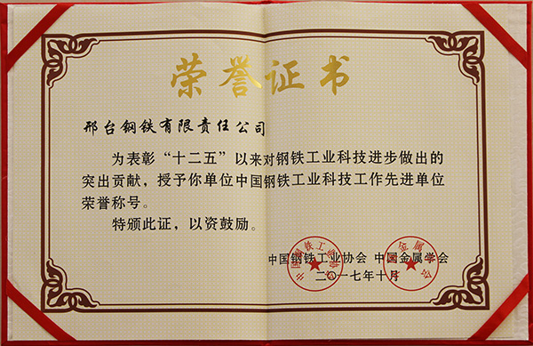 2017年10月,邢鋼被中國鋼鐵工業(yè)協(xié)會(huì)和中國金屬學(xué)會(huì)聯(lián)合授予“十二五”中國鋼鐵工業(yè)科技工作先進(jìn)單位榮譽(yù)稱號(hào)。