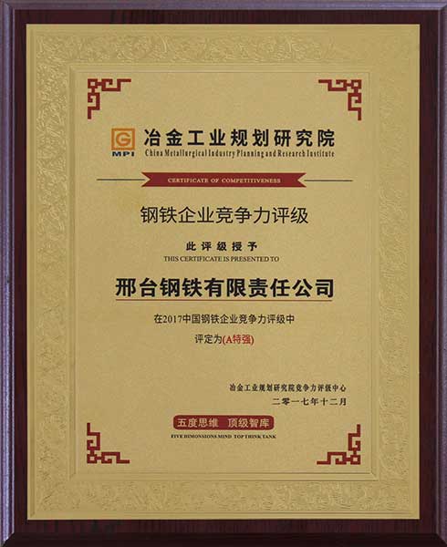 2017年12月,冶金工業(yè)規(guī)劃研究院競爭力評(píng)級(jí)中心授予邢鋼“在2017中國鋼鐵企業(yè)競爭力評(píng)級(jí)中評(píng)定為A特強(qiáng)”企業(yè)。