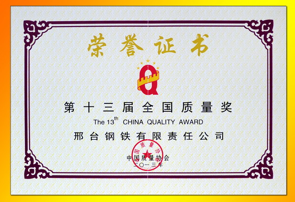 2013年11月3日,由中國質(zhì)量協(xié)會(huì)組織舉辦的第十三屆全國追求卓越大會(huì)在北京召開,會(huì)議主題是“科學(xué)發(fā)展——實(shí)現(xiàn)有質(zhì)量的增長”。大會(huì)隆重舉行了全國質(zhì)量獎(jiǎng)?lì)C獎(jiǎng)儀式,邢鋼董事長袁世臻、總經(jīng)理張永藏出席會(huì)議并上臺(tái)領(lǐng)取質(zhì)量管理的最高榮譽(yù)“全國質(zhì)量獎(jiǎng)”。邢鋼也同時(shí)成為本屆11家全國質(zhì)量獎(jiǎng)獲獎(jiǎng)組織中唯一一家鋼鐵企業(yè)。