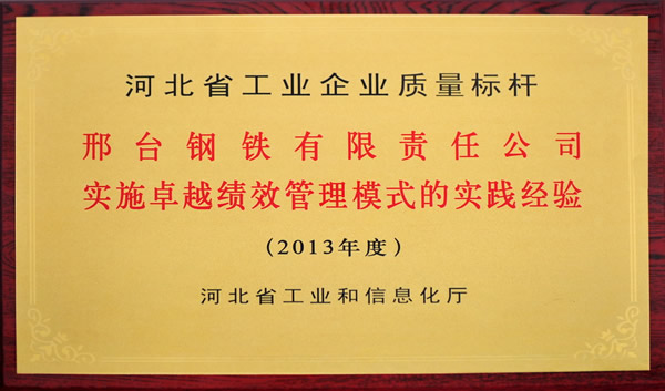 2013年7月12日,省工信廳在石家莊召開(kāi)了2013年第五期國(guó)家新型工業(yè)化產(chǎn)業(yè)示范基地質(zhì)量標(biāo)桿經(jīng)驗(yàn)交流會(huì),會(huì)上舉行了省質(zhì)量標(biāo)桿授牌儀式,邢鋼公司參加會(huì)議并接受了授牌。