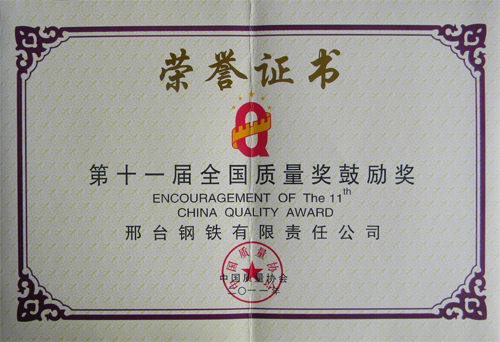 2011年10月,邢鋼榮獲“第十一屆全國(guó)質(zhì)量獎(jiǎng)鼓勵(lì)獎(jiǎng)”。