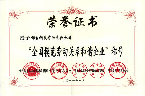 2011年8月,邢鋼榮獲由人力資源和社會(huì)保障部、全國(guó)總工會(huì)、中國(guó)企業(yè)聯(lián)合會(huì)、全國(guó)工商聯(lián)頒發(fā)的“全國(guó)模范勞動(dòng)關(guān)系和諧企業(yè)”榮譽(yù)稱號(hào)。