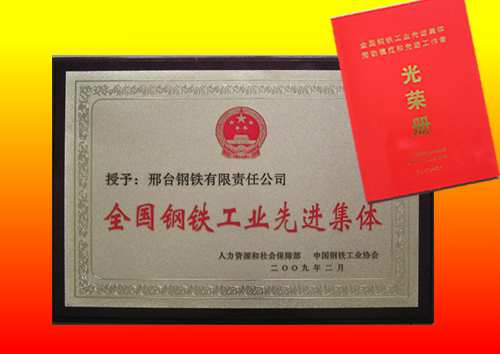 2009年2月,人力資源和社會保障部、中國鋼鐵工業(yè)協(xié)會授予邢鋼“全國鋼鐵工業(yè)先進集體”榮譽稱號。