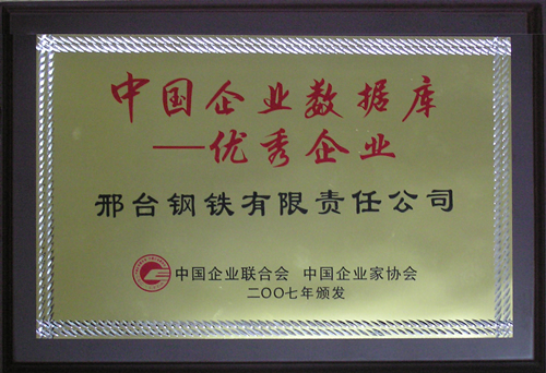 2007年12月,邢鋼榮獲由中國企業(yè)聯合會、中國企業(yè)家協(xié)會頒發(fā)的“中國企業(yè)數據庫優(yōu)秀企業(yè)”榮譽稱號。