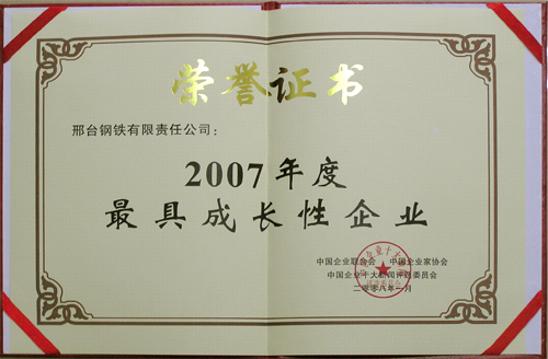 2008年1月,邢鋼榮獲由中國企業(yè)聯合會、中國企業(yè)家協(xié)會頒發(fā)的“2007年度最具成長性企業(yè)”榮譽稱號。