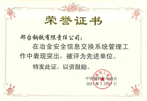 2022年1月,邢鋼被河北省應(yīng)急管理與安全生產(chǎn)協(xié)會(huì)評為“2021年度應(yīng)急管理與安全生產(chǎn)先進(jìn)單位”。