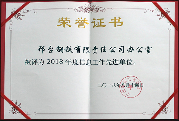 2018年8月14日,邢鋼被中國鋼鐵工業(yè)協(xié)會評為“2018年度信息工作先進(jìn)單位”。