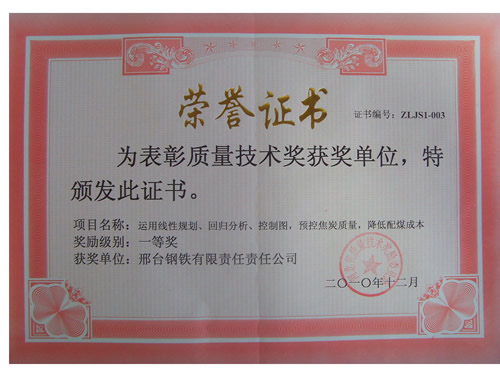 - 近日獲悉,我公司申報(bào)的“運(yùn)用線性規(guī)劃、回歸分析、控制圖預(yù)控焦炭質(zhì)量,降低配煤成本”質(zhì)量技術(shù)成果,經(jīng)河北省質(zhì)量技術(shù)獎(jiǎng)勵(lì)委員會(huì)評(píng)選,獲得一等獎(jiǎng)。該項(xiàng)目是焦化廠運(yùn)用質(zhì)量統(tǒng)計(jì)技術(shù)工具經(jīng)過實(shí)踐取得的一項(xiàng)質(zhì)量技術(shù)成果。通過實(shí)施該項(xiàng)目,配合煤成本比2008年降低了4775萬(wàn)元,保持了焦炭質(zhì)量的持續(xù)穩(wěn)定。
