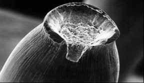 中心毛刺的斷口一般呈杯狀或者錐狀。主要是因為鋼絲拉拔過程中表面和內(nèi)部受力不均導致。