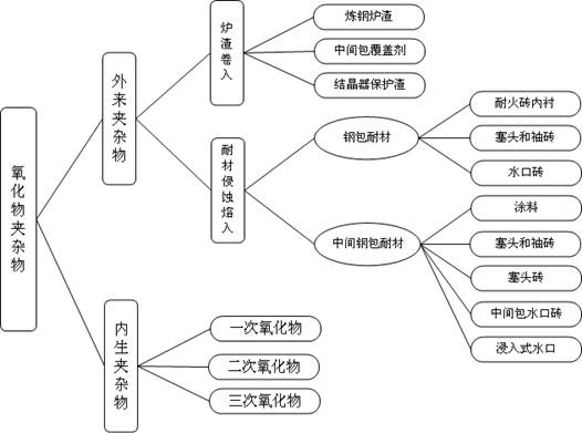 而外來夾雜主要是在鋼的熔煉、出鋼和澆鑄過程中,鋼液同耐火材料和爐渣相接觸,爐渣被卷入鋼液中(特別是出鋼的時候),耐火材料在高溫收到?jīng)_蝕,它的顆?;烊脘撘褐校@些情況都難以避免。混入鋼液中的耐火材料和爐渣顆粒通過與鋼液起化學(xué)反應(yīng)不斷在成分和結(jié)構(gòu)上發(fā)生變化。這些顆粒,不論是剛剛被機(jī)械地帶入鋼液中的,還是經(jīng)歷了相當(dāng)變化的,一旦被滯留到鑄件中,就變成了鋼中的夾雜物,這些就叫外來夾雜物。外來一般來說尺寸較大,外形不規(guī)則,結(jié)構(gòu)復(fù)雜,只是偶然在這里或者那里出現(xiàn)。夾雜物的來源和分類下圖。