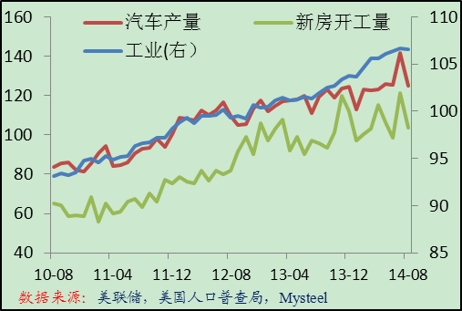 從下游行業(yè)看,8月份美國經(jīng)濟(jì)強勁增長態(tài)勢放緩,季節(jié)性因素可能是主因,但從同比增速看,美國經(jīng)濟(jì)強勁增長趨勢可能將放緩。8月份汽車產(chǎn)量同比增長4.5%,環(huán)比下降11.7%;工業(yè)產(chǎn)出同比增長4.8%,環(huán)比下降0.1%;新房開工量同比增長8%,環(huán)比下降14.4%。