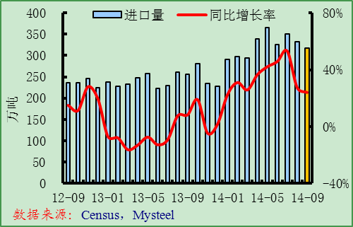 8月份美國鋼材進(jìn)口量為333萬噸,同比增長27.4%,但環(huán)比下降5%。分品種看,與去年8月份相比,主要品種進(jìn)口量均實現(xiàn)增長,依然是冷軋、鍍鋅板與中厚板的進(jìn)口量增長最明顯,其中中厚板增長114%,冷軋增長65.7%,鍍鋅板增長46.1%。與今年7月份比,除半成品、長材、線材和螺紋鋼進(jìn)口量環(huán)比增長外,其他品種均環(huán)比下降,其中螺紋鋼增長最快,為191.5%。最新的統(tǒng)計數(shù)據(jù)顯示,截至到2014年9月24日,9月份美國鋼材進(jìn)口許可證數(shù)為317萬噸,高于去年9月水平,與8月份同期數(shù)據(jù)基本持平,預(yù)計今年9月份美國鋼材進(jìn)口量同比仍將大幅增加,環(huán)比基本持平或略有增長。