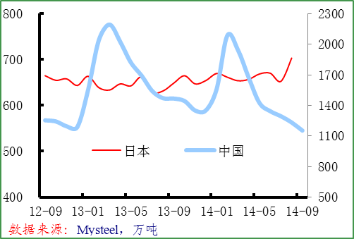 9月份中國流通環(huán)節(jié)鋼材庫存繼續(xù)下降,9月底全國主要鋼的社會庫存為1154萬噸,比8月底下降80萬噸,較去年同期下降314萬噸,鋼廠價格大幅下滑,貿(mào)易商加大了去庫存力度。中鋼協(xié)統(tǒng)計數(shù)據(jù)顯示,9月中旬末重點鋼企鋼材庫存為1590萬噸,較8月中旬末增長65萬噸,全國重點鋼廠鋼廠庫存連續(xù)兩個月增長。日本國內(nèi)庫存大幅上升,8月末全國鋼材庫存為703萬噸,創(chuàng)10年來最高水平,鋼廠庫存增長明顯,市場需求難以消化供應(yīng)。