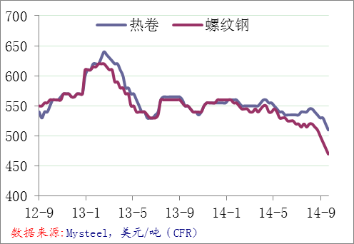 9月份國際市場漲跌互現(xiàn),歐美市場相對較好,亞洲市場下跌明顯。9月份歐洲扁平材價格小幅上漲,主要是需求季節(jié)性恢復(fù)所致,而廢鋼價格下滑則導(dǎo)致長材價格走弱。目前歐洲經(jīng)濟(jì)仍然低迷,9月份需求復(fù)蘇低于預(yù)期,10月份也難有上佳表現(xiàn),隨著廢鋼價格走低,預(yù)計10月份歐洲市場將疲軟運行。9月份美國薄板價格走勢,長材價格小幅上漲。從下游行業(yè)數(shù)據(jù)看,9月份美國經(jīng)濟(jì)增長開始放緩,鋼鐵需求強度也開始下降,這也是薄板價格下滑的根本原因。展望10月份,預(yù)計需求難有太大起色,雖然國內(nèi)鋼廠開始減產(chǎn),但進(jìn)口和庫存壓力依然存在,加上廢鋼價格預(yù)期走弱,預(yù)計10月份美國市場將盤整運行。9月份亞洲市場大幅下滑,主要是中國下跌帶動。目前亞洲主要國家經(jīng)濟(jì)增長均開始放緩,短期內(nèi)恢復(fù)的可能性不大,10月份市場需求仍然疲軟,而鋼廠減產(chǎn)力度也不會太大,但考慮到原料價格已經(jīng)基本觸底,預(yù)計10月份亞洲市場將在底部盤整運行。整體上判斷,10月份國際市場將盤整運行。