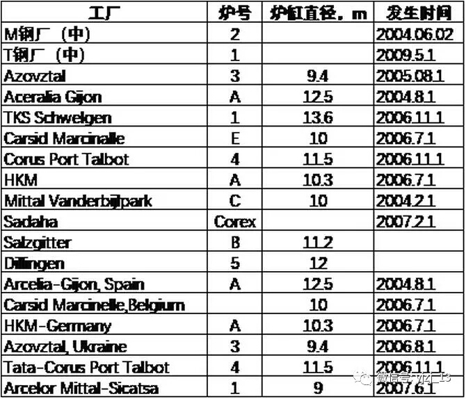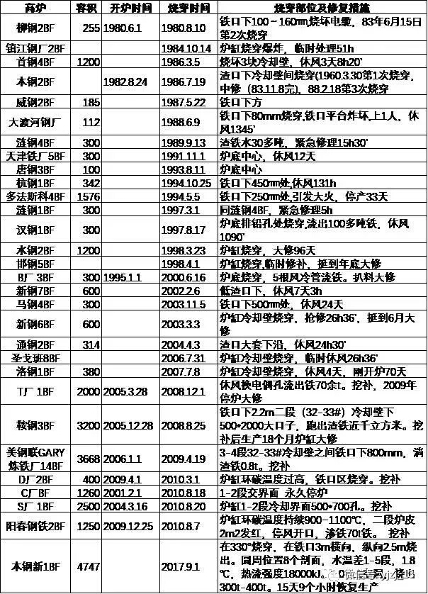 以下針對國內(nèi)外典型高爐爐缸燒出案例進行統(tǒng)計,并對燒出原因、修復和維護等方面進行詳細的說明,為國內(nèi)外高爐的長壽提供技術和數(shù)據(jù)參考。