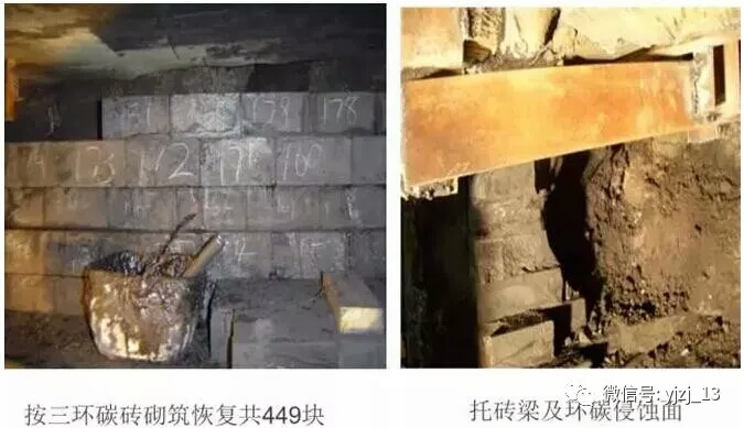 利用工程剩余的UCAR炭磚重新砌筑,部分炭磚需要現(xiàn)場加工外型,縫隙采用炭質(zhì)泥漿。總計砌筑11層,449塊炭磚。