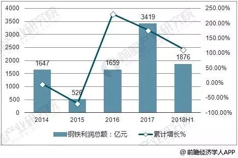 近年來(lái),鋼鐵行業(yè)盈利能力持續(xù)穩(wěn)定增長(zhǎng),2017年鋼鐵行業(yè)利潤(rùn)總額達(dá)到3419億元,與2016年相比增長(zhǎng)率高達(dá)177.8%;2018上半年行業(yè)利潤(rùn)達(dá)到1876億元,增長(zhǎng)率為113%,鋼鐵行業(yè)利潤(rùn)的整體向好。