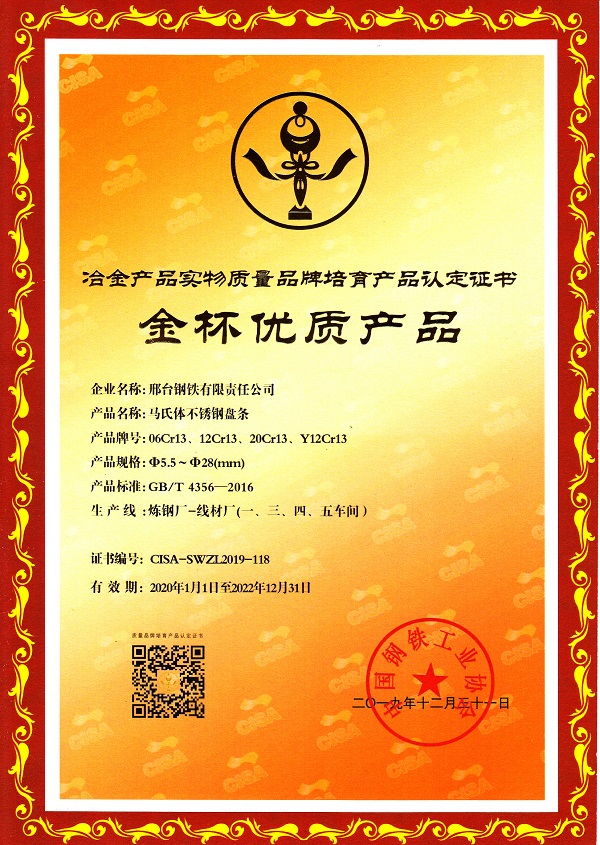 Recently, our 3 products including 7 trademarks obtained the quality certificate of Gold Cup Quality Products for Metallurgical Products. Xingtai Steel is the most awarded manufacturer of wire products in domestic metallurgical industry. The 3 products include the wire for copper weld wire rod (XGM6-1),the ferrite stainless steel wire rod and martensitic stainless-steel wire rod.