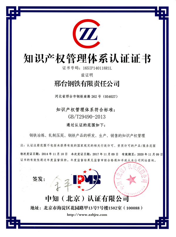 The experts gave a very high evaluation on the management of intellectual property. They believed that Xingtai Steel made a great progress on intellectual property management after certification in 2014 and the management level of intellectual property had been improved. During the audit, no non-conformance term was found, and certification was passed.