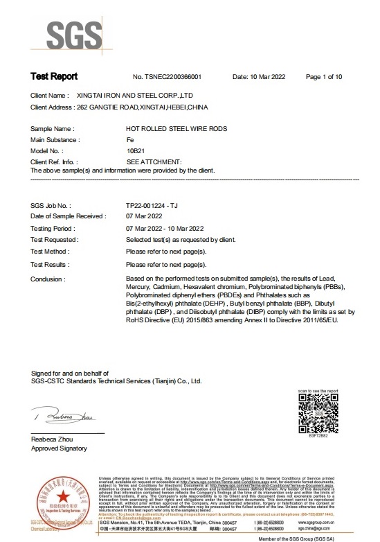 RoHS and SVHC not detected in the wire rod by Xingtai Steel
