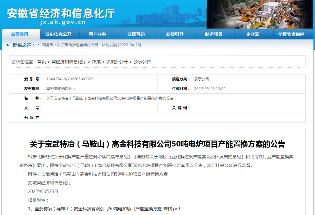 根據(jù)《國務(wù)院關(guān)于化解產(chǎn)能嚴(yán)重過剩矛盾的指導(dǎo)意見》《國務(wù)院關(guān)于鋼鐵行業(yè)化解過剩產(chǎn)能實(shí)現(xiàn)脫困發(fā)展的意見》和《鋼鐵行業(yè)產(chǎn)能置換實(shí)施辦法》要求,現(xiàn)將寶武特冶(馬鞍山)高金科技有限公司50噸電爐項目產(chǎn)能置換方案予以公告,歡迎社會公眾進(jìn)行監(jiān)督。