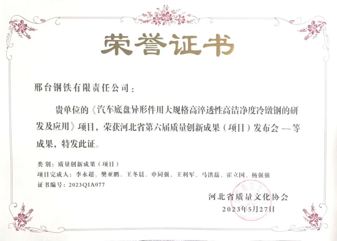 從近日召開的河北省第六屆質(zhì)量創(chuàng)新成果(項(xiàng)目)發(fā)布會(huì)上獲悉:邢臺(tái)鋼鐵有限責(zé)任公司(以下簡(jiǎn)稱邢鋼)再次斬獲多項(xiàng)省級(jí)質(zhì)量創(chuàng)新成果殊榮,其中:《汽車底盤異形件用大規(guī)格高淬透性高潔凈度冷鐓鋼的研究及應(yīng)用》、《提高超低碳鋼成品碳含量≤50ppm比例》、《優(yōu)質(zhì)碳素鋼拉拔斷裂問題的改善與研究》榮獲示范級(jí)質(zhì)量創(chuàng)新成果;《提高6#高爐生鐵產(chǎn)量》和《全流程能效監(jiān)管系統(tǒng)的搭建與應(yīng)用》榮獲專業(yè)級(jí)質(zhì)量創(chuàng)新成果;《降低成品線材擦劃傷率》榮獲改進(jìn)級(jí)質(zhì)量創(chuàng)新成果。