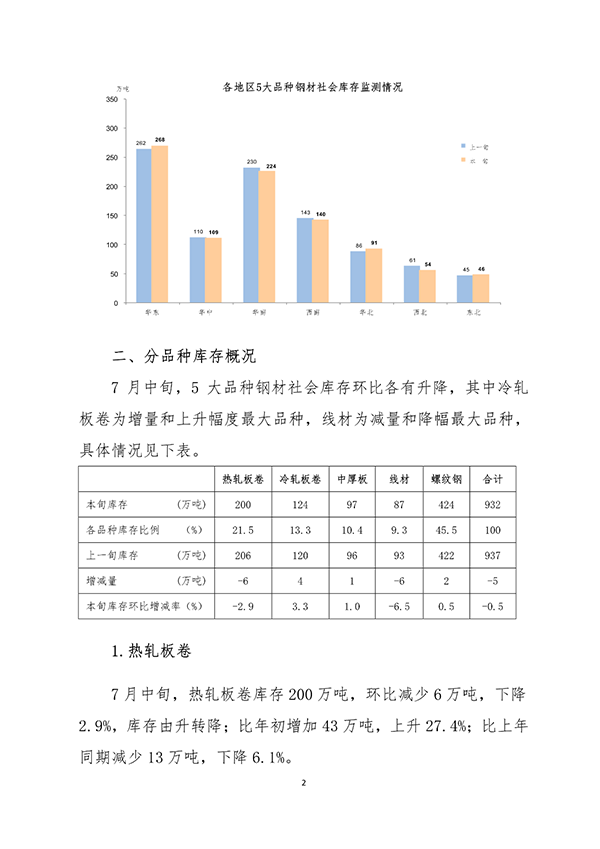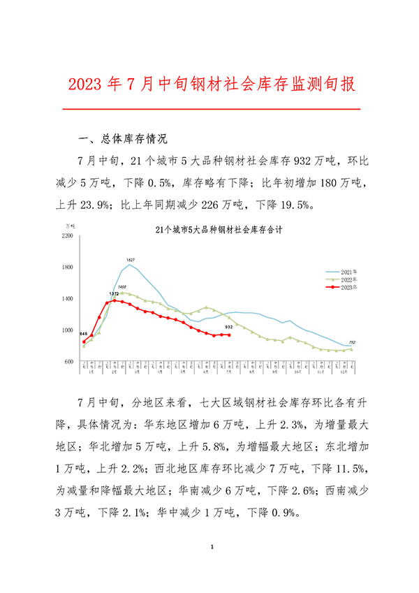 中鋼協(xié):7月中旬鋼材社會庫存932萬噸 環(huán)比下降0.5%