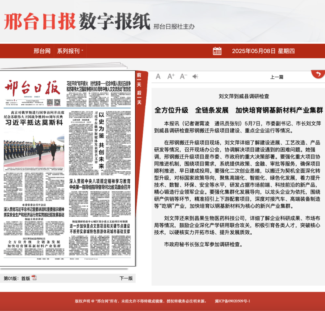 本報訊(記者謝霄凌 通訊員張釗)5月7日,市委副書記、市長劉文萍到威縣調(diào)研檢查邢鋼搬遷升級項目建設、重點企業(yè)運行等情況。