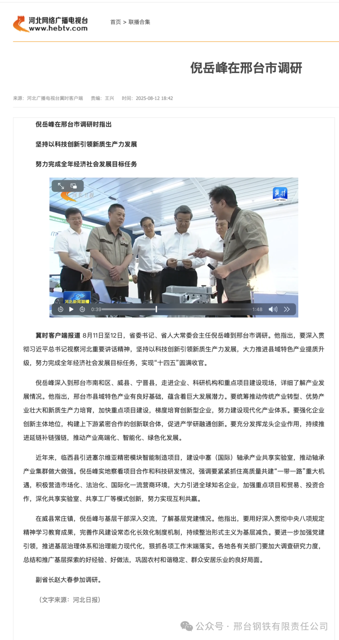 冀時客戶端報道 8月11日至12日,省委書記、省人大常委會主任倪岳峰到邢臺市調(diào)研。他指出,要深入貫徹習(xí)近平總書記視察河北重要講話精神,堅持以科技創(chuàng)新引領(lǐng)新質(zhì)生產(chǎn)力發(fā)展,大力推進縣域特色產(chǎn)業(yè)提質(zhì)升級,努力完成全年經(jīng)濟社會發(fā)展目標(biāo)任務(wù),實現(xiàn)“十四五”圓滿收官。