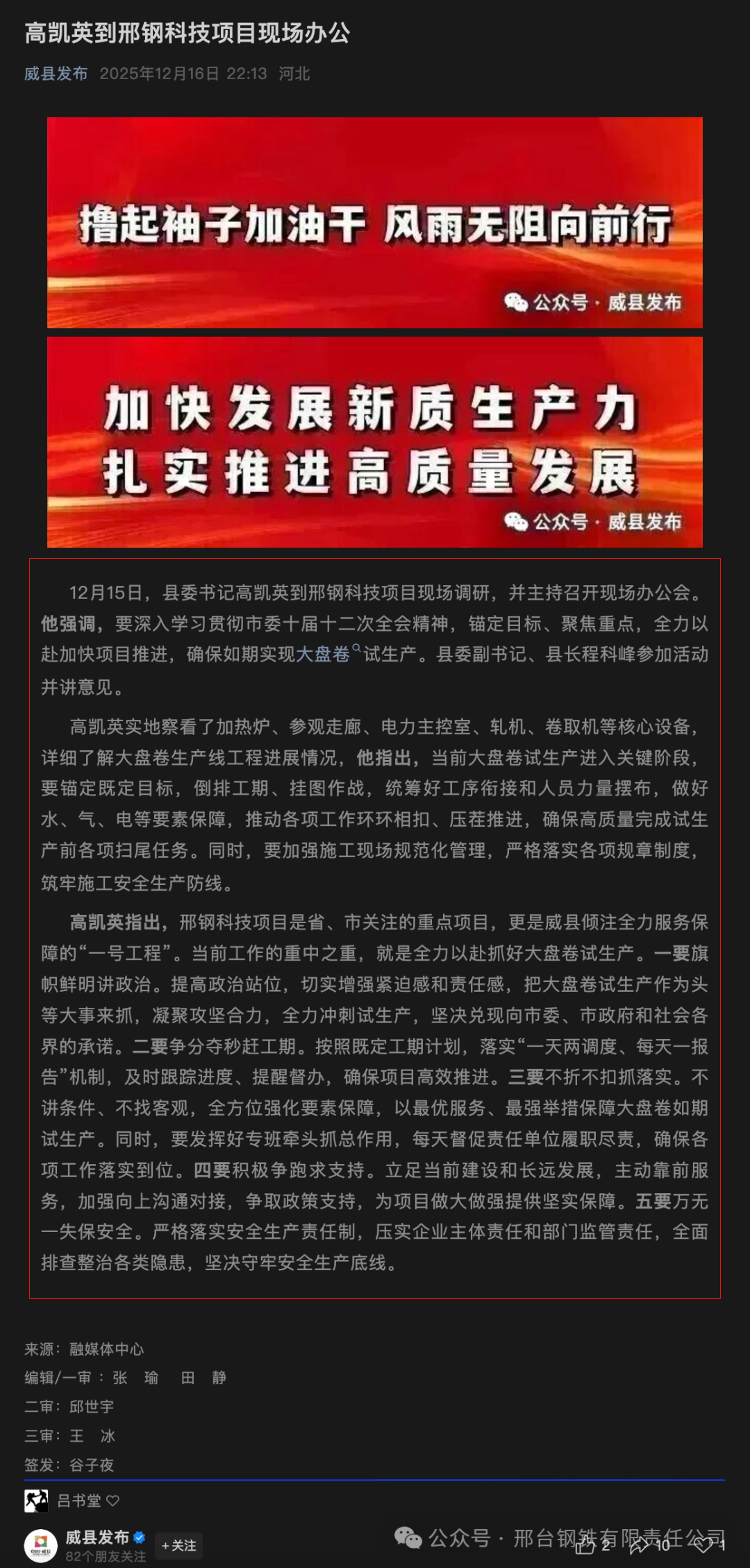 高凱英指出,邢鋼科技項目是省、市關(guān)注的重點項目,更是威縣傾注全力服務(wù)保障的“一號工程”。當(dāng)前工作的重中之重,就是全力以赴抓好大盤卷試生產(chǎn)。一要旗幟鮮明講政治。提高政治站位,切實增強緊迫感和責(zé)任感,把大盤卷試生產(chǎn)作為頭等大事來抓,凝聚攻堅合力,全力沖刺試生產(chǎn),堅決兌現(xiàn)向市委、市政府和社會各界的承諾。二要爭分奪秒趕工期。按照既定工期計劃,落實“一天兩調(diào)度、每天一報告”機制,及時跟蹤進度、提醒督辦,確保項目高效推進。三要不折不扣抓落實。不講條件、不找客觀,全方位強化要素保障,以最優(yōu)服務(wù)、最強舉措保障大盤卷如期試生產(chǎn)。同時,要發(fā)揮好專班牽頭抓總作用,每天督促責(zé)任單位履職盡責(zé),確保各項工作落實到位。四要積極爭跑求支持。立足當(dāng)前建設(shè)和長遠(yuǎn)發(fā)展,主動靠前服務(wù),加強向上溝通對接,爭取政策支持,為項目做大做強提供堅實保障。五要萬無一失保安全。嚴(yán)格落實安全生產(chǎn)責(zé)任制,壓實企業(yè)主體責(zé)任和部門監(jiān)管責(zé)任,全面排查整治各類隱患,堅決守牢安全生產(chǎn)底線。