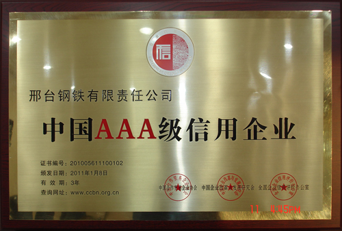 日前,在由中國合作貿(mào)易企業(yè)協(xié)會(huì)、中國企業(yè)改革與發(fā)展研究會(huì)、全國企業(yè)信用評價(jià)辦公室組織召開的中國企業(yè)科學(xué)發(fā)展論壇暨誠信表彰大會(huì)上,邢鋼被評為2010年度“中國AAA級(jí)信用企業(yè)”、公司榮獲“全國文明誠信示范單位” 稱號(hào)、董事長、總經(jīng)理袁世臻榮獲“全國優(yōu)秀誠信企業(yè)家” 稱號(hào)。